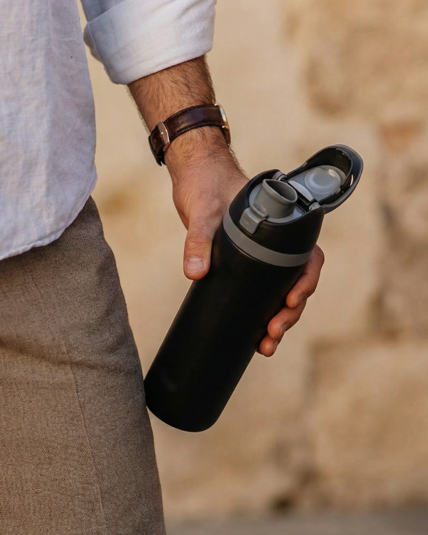 DOBLE PICO - Capacidad: 450 Ml - Material: Acero inoxidable 304 - Térmico: Sí - Versátil: Tanto para líquidos fríos como calientes - Ancho: 8 Cm. - Profundidad: 7 Cm. - Alto: 17 Cm. - Libre de BPA: Sí - Certificado INAL: Sí - 2 opciones de uso: Pico y sorbete. - Bebidas frías: 12 hs. - Bebidas calientes: 6 hs. - Peso: 290 Grs.